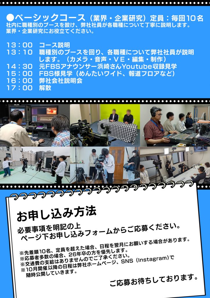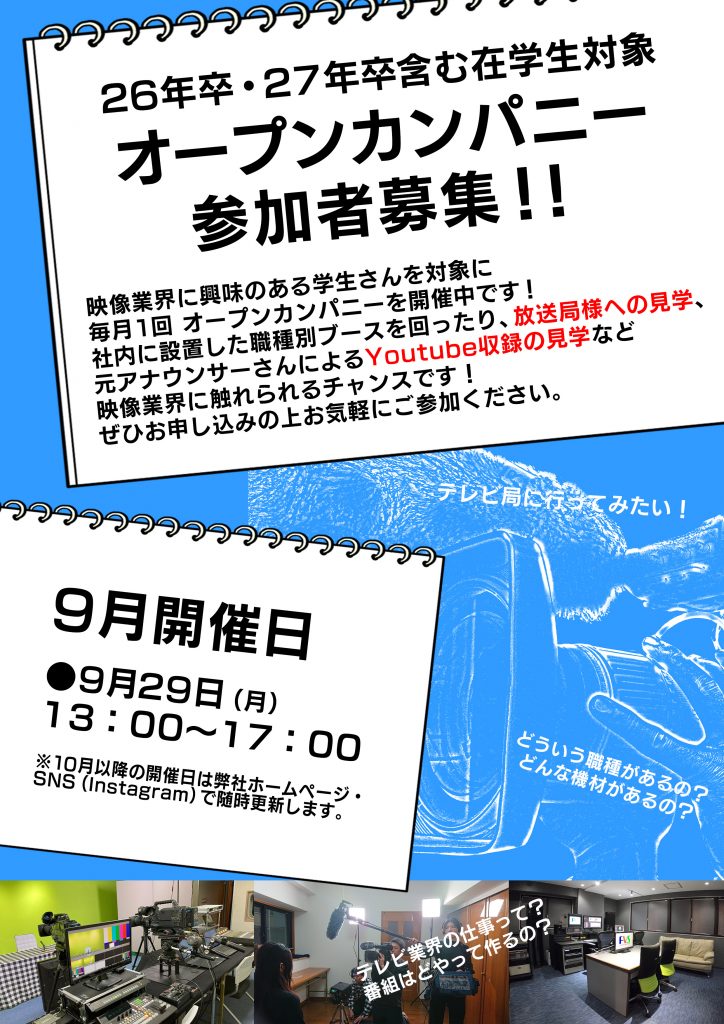 弊社では、26年卒・27年卒含む在学生向けオープンカンパニーを開催中です。毎月1回、映像業界に興味のある初心者の方、映像系の学科を専攻されている方、業界研究や企業研究にお役立てください。毎回10名様限定です。お申し込みは下記お申込みフォームからお願いいたします。毎月の開催日はホームページ・SNS(Instagram)で随時お知らせします。少しでも興味を持たれましたらぜひご参加ください。皆さまにお会いできることを社員一同楽しみにしております。